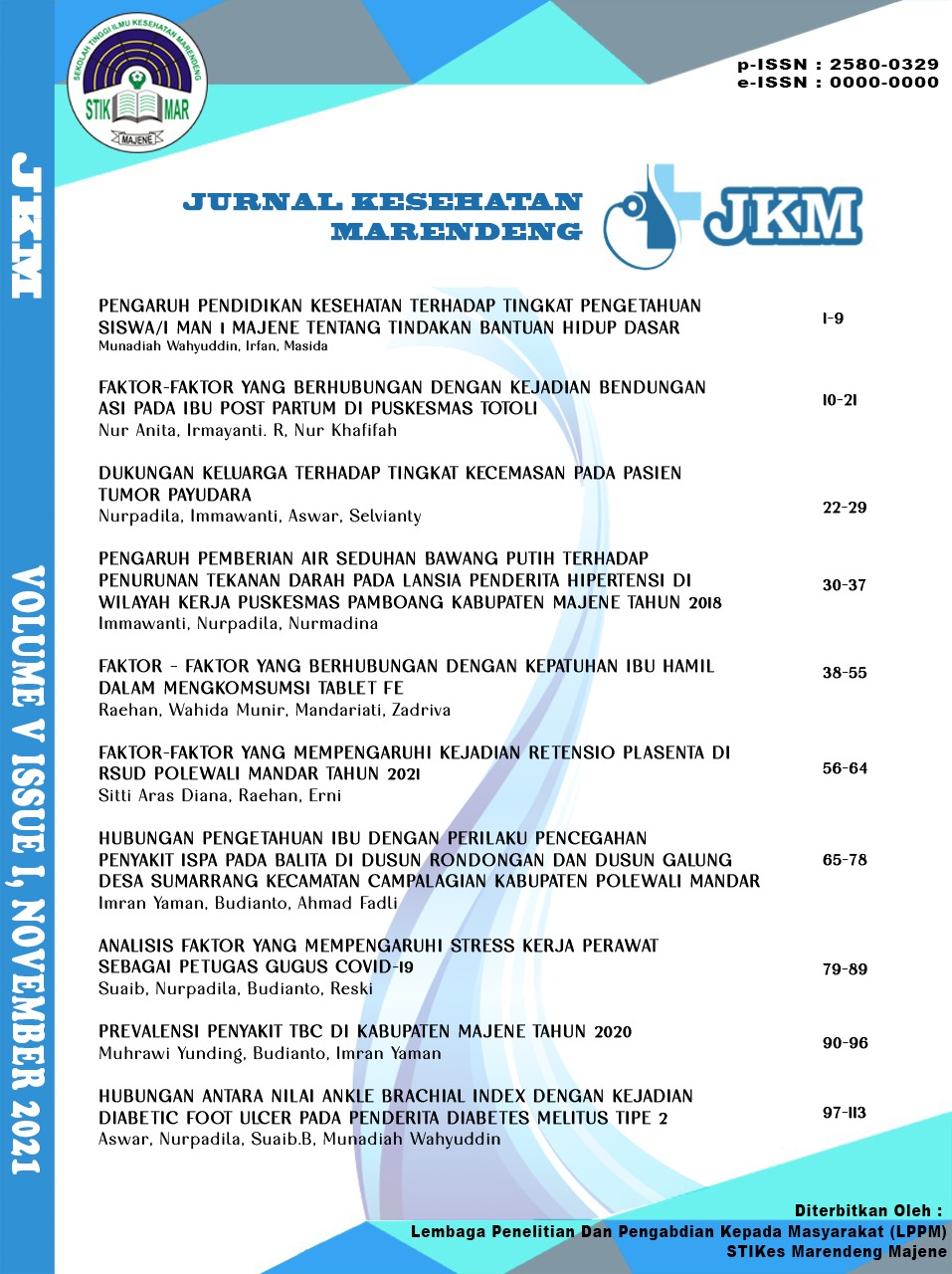 Bantuan hidup dasar merupakan suatu usaha untuk mempertahankan kehidupan seseorang yang sedang terancam jiwanya yang mengalami henti napas, henti jantung, maupun perdarahan. Pada korban kecelakaan lalu lintas, satu jam pertama adalah waktu yang sangat penting dalam penanganan dan penyelamatan korban. Tindakan bantuan hidup dasar yang dapat menyelamatkan jiwa salah satunya adalah resusitasi jantung paru yang mana dapat dilakukan oleh siapa saja yang terlatih. Salah satu upaya peningkatan pengetahuan dan keterampilan adalah dengan melakukan pendidikan kesehatan. Adapun tujuan penelitian ini untuk mengetahui pengaruh pendidikan kesehatan terhadap tingkat pengetahuan siswa/siswi MAN 1 Majene tentang Batuan Hidup dasar pada kecelakaan lalu lintas. Penelitian ini menggunakan Desain penelitian one group pre test-post test untuk membandingkan pengetahuan tentang BHD sebelum dan sesudah dilakukan pendidikan kesehatan dengan jumlah sampel 35 orang dengan tekhnik pengambilan data melalui kuesioner. Berdasarkan hasil uji statistik, uji Normalitas dan Uji T berpasangan didapatkan nilai P-Value = 0,000 (<0,005). Sehingga disimpulkan bahwa ada pengaruh pendidikan kesehatan terhadap tingkat pengetahuan siswa/siswi MAN 1 Majene tentang Bantuan Hidup Dasar pada kecelakaan lalu lintas.